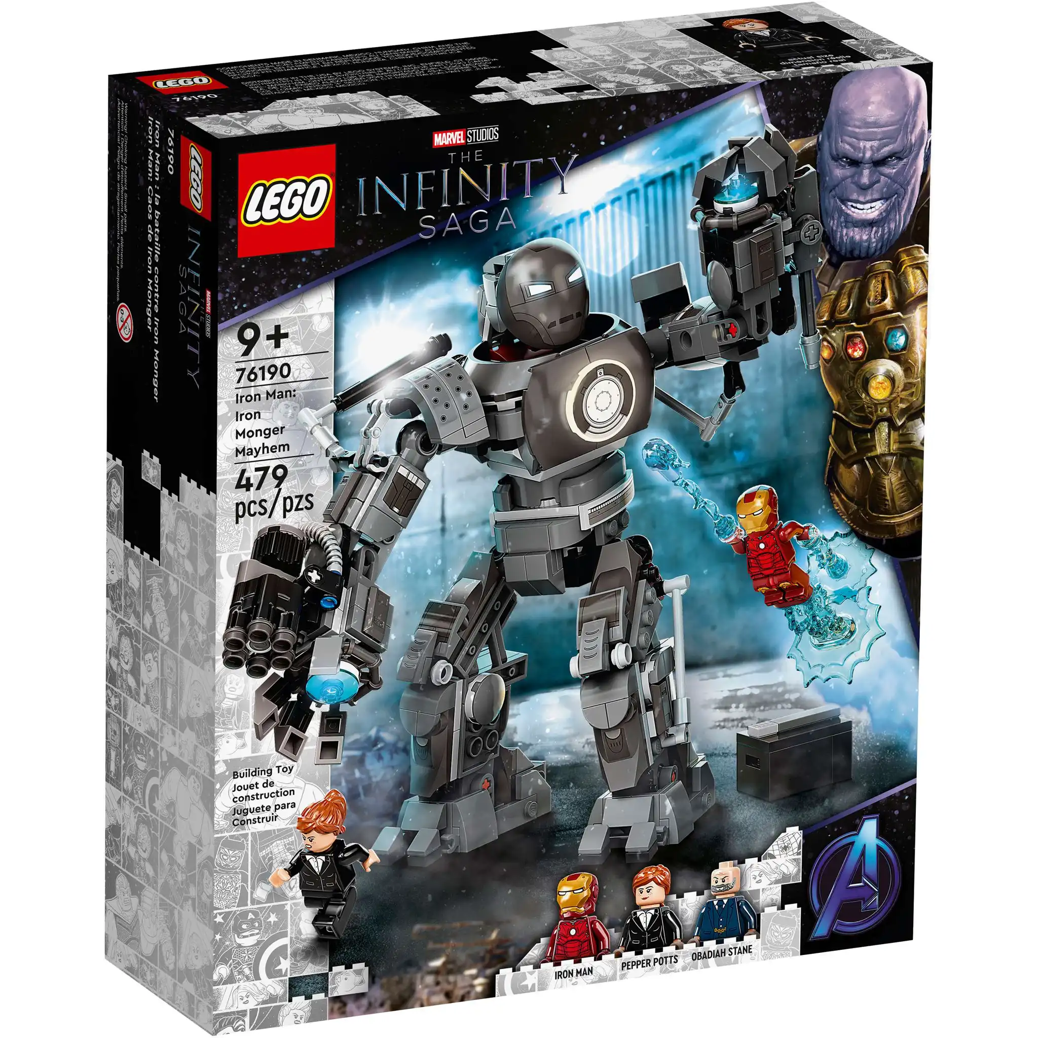 S’inspirant de scènes culte du premier film Iron Man des studios Marvel, ce fabuleux jeu de construction entraîne les enfants dans des aventures épiques avec l’une des créatures iconiques de Marvel : le robot Iron Monger. Son réacteur Arc brille lorsque les enfants le font tourner ou le positionnent pour tirer avec les fusils à 3 et 6 tenons de ses bras. Ils peuvent répliquer en utilisant le puissant canon d’Iron Man pour sauver Pepper et vaincre le monstre de métal.
