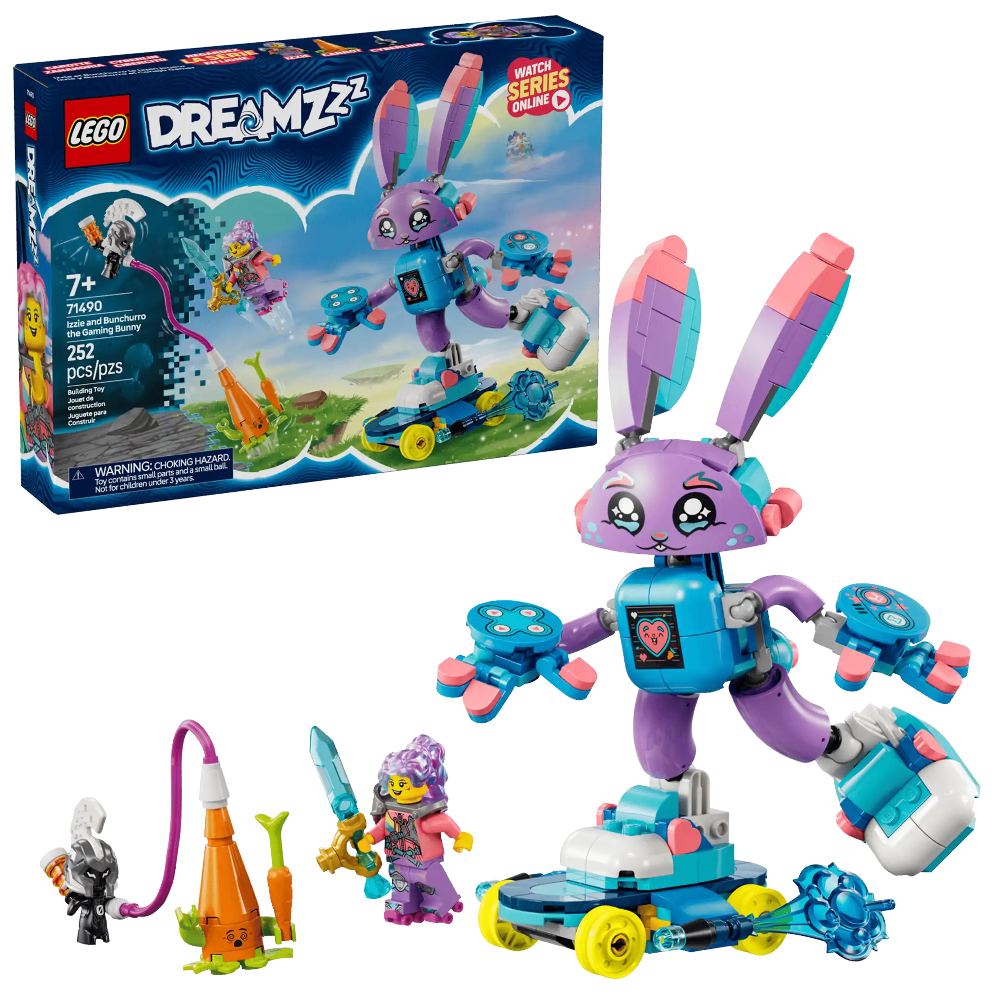 Les jeunes rêveurs s’amuseront à construire la figurine de Bunchurro, une version inédite de Bunchu le lapin, équipée d’un écran sur le ventre, de gants de gaming et de baskets stylées. Ils pourront ensuite le transformer de deux façons : en l’accessoirisant avec un skateboard et des propulseurs, ou en lui ajoutant un jetpack. Entièrement articulé, le lapin reste mobile dans toutes ses configurations, et l’action prend vie grâce à la minifigurine d’Izzie, qui peut s’accrocher dans le dos de Bunchurro pour encore plus de jeu de rôle.