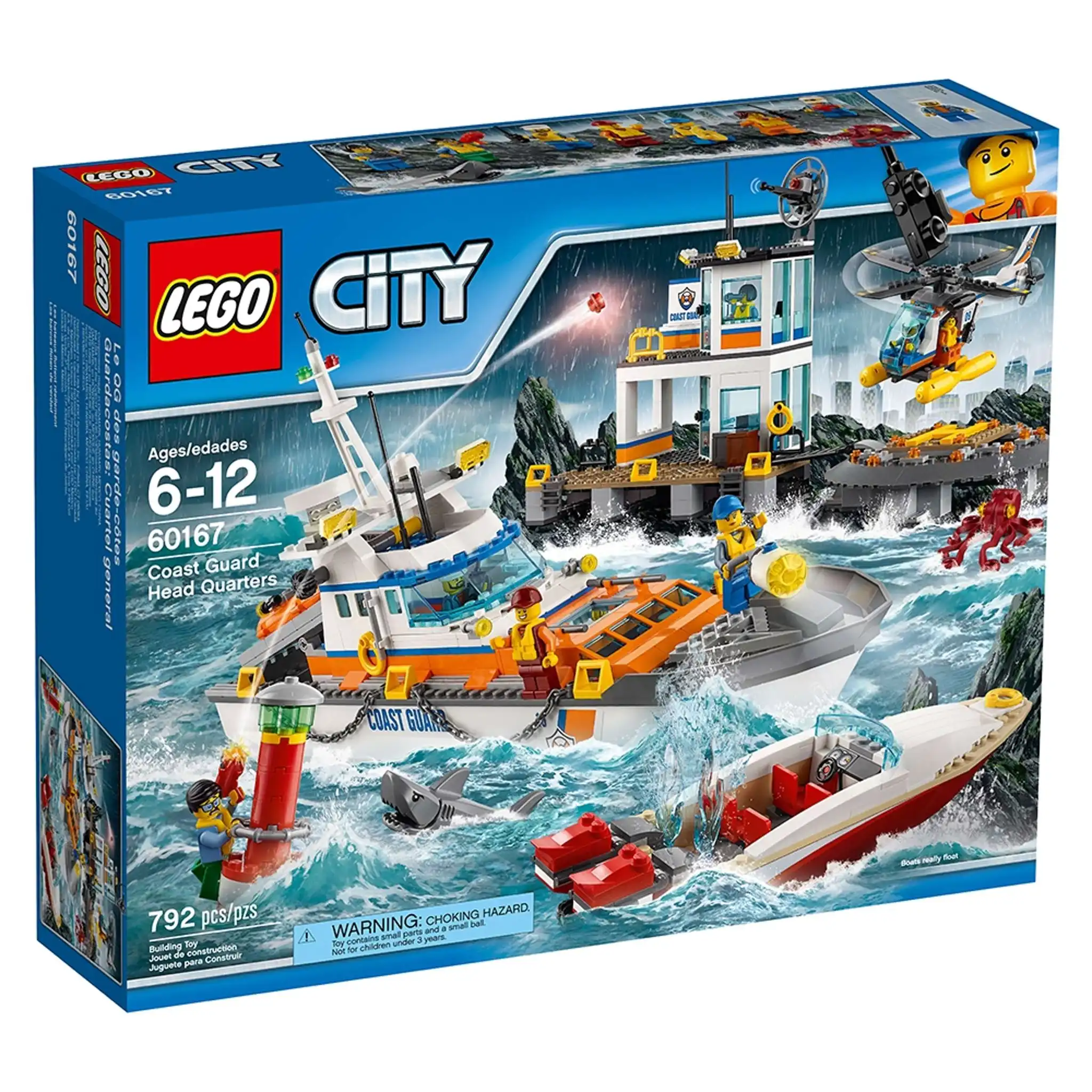L’équipe des gardes-côtes de LEGO® City est au QG des gardes-côtes. Le bâtiment comprend deux niveaux, des bureaux et une salle de contrôle radar. Il y a aussi un bateau avec un pont qui s’ouvre et un pont, un radar et un projecteur mobiles, une zone médicale et un radeau de sauvetage avec une fonction de lancement, ainsi qu’un hélicoptère avec un héliport, un hors-bord et une bouée à construire. Inclut sept figurines, plus des figurines de requin et de poulpe.
