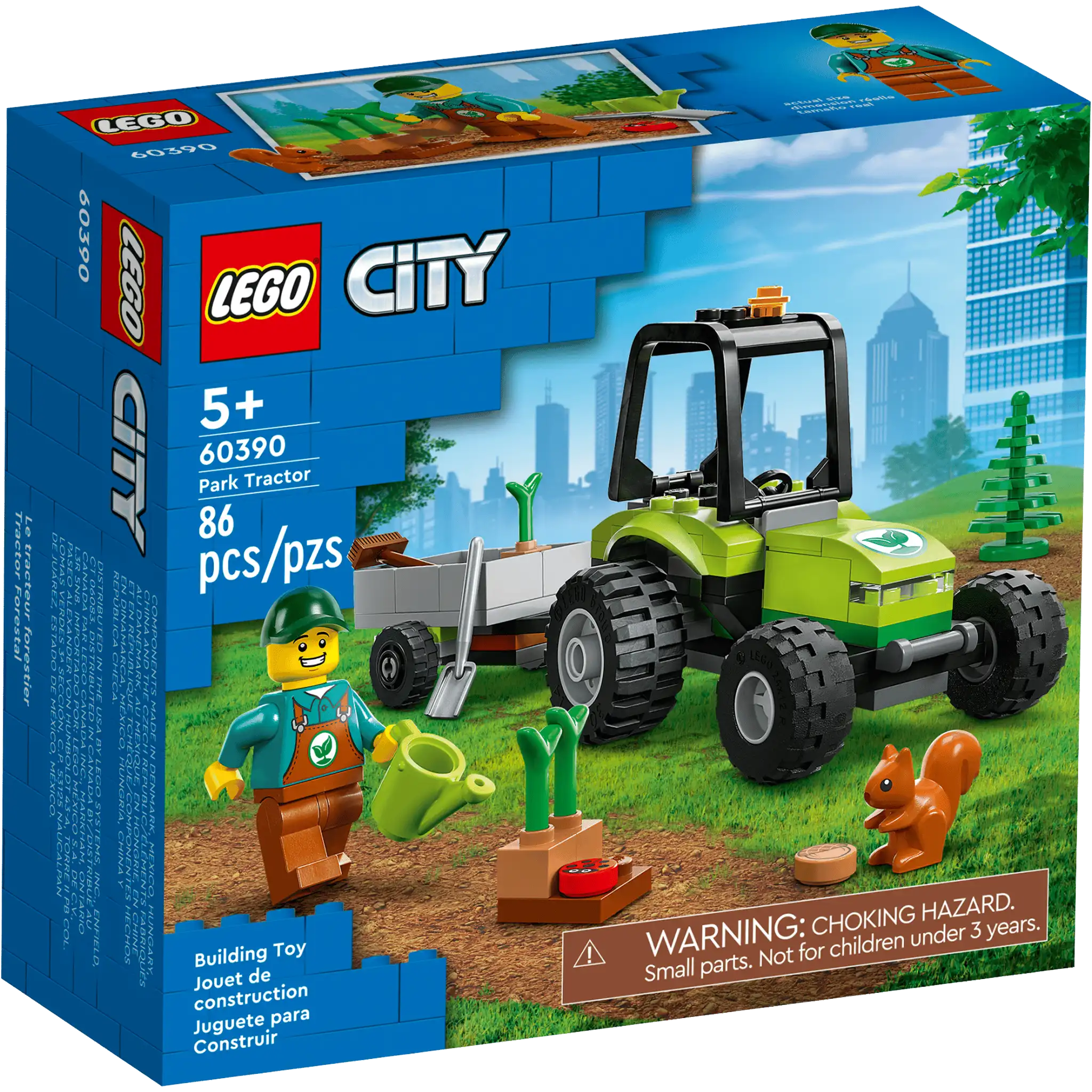 Les enfants partent en expédition pour planter des arbres avec Le tracteur forestier LEGO® City (60390), qui inclut un tracteur avec une remorque, un arbre, de jeunes plants et des outils de jardinier, ainsi qu’une minifigurine de jardinier, une coccinelle et un écureuil.